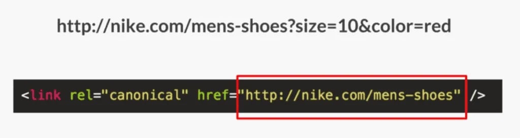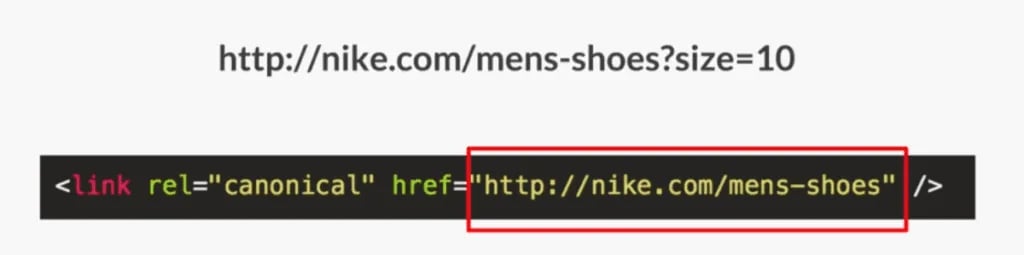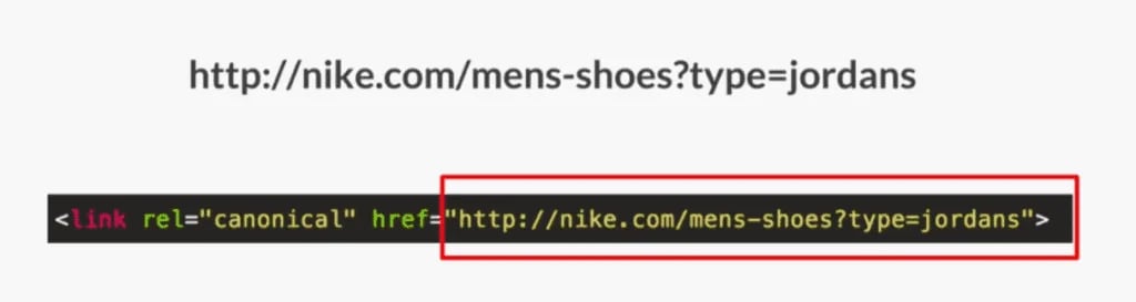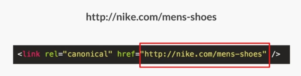 If I’m on “nike.com/mens-shoes” (the original version of the page) and I want to implement a canonical tag here, I would use a link tag with a rel=“canonical” HTTP header attribute and the href attribute “nike.com/mens-shoes”.