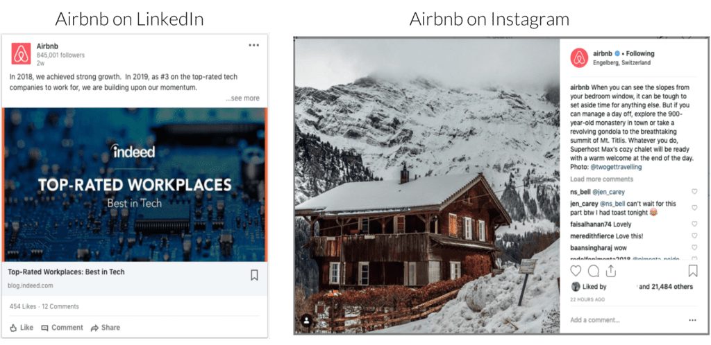 - Understand who your target persona is. For example, Airbnb focuses its LinkedIn efforts on potential employees and Instagram on guests.