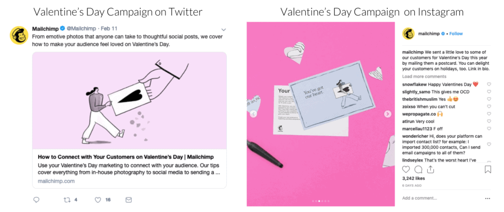 Adapt your message to the social media channels you participate in. For example, Mailchimp adapts their campaign assets to take advantage of the strengths of each channel.
