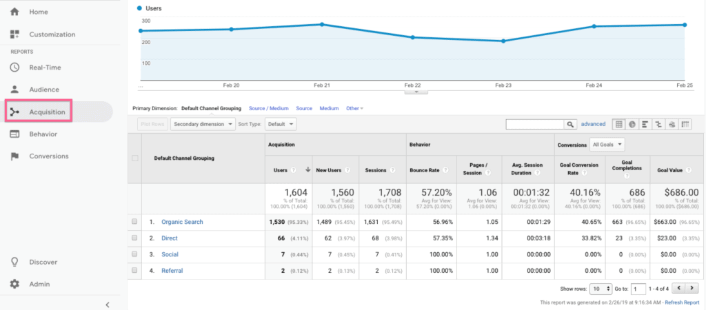Acquisition reports tell you where your visitors are coming from. This is helpful in analyzing the performance of the top of your funnel.