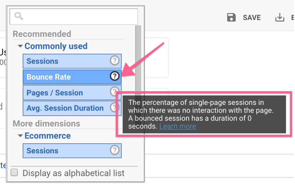 Lastly, if you find a metric you don’t understand, you can simply find the definition and more information about it directly inside Google Analytics: