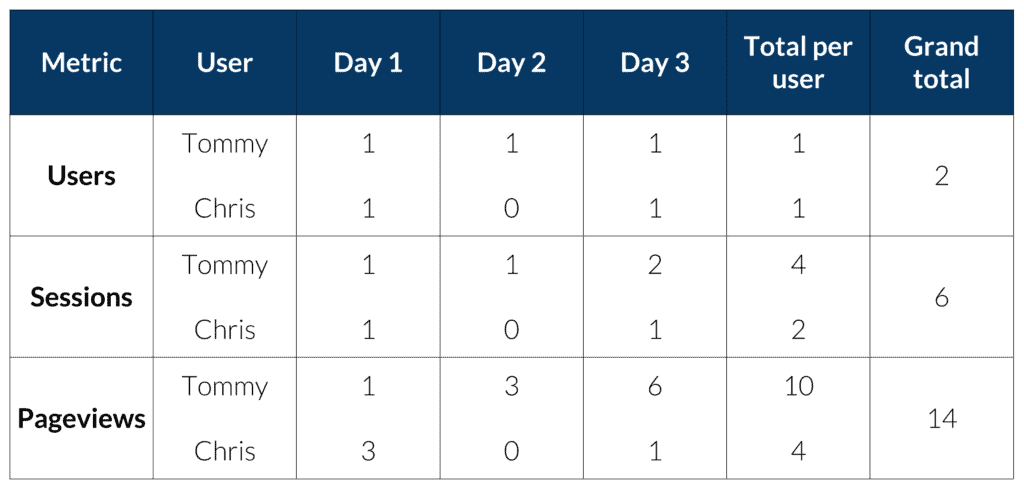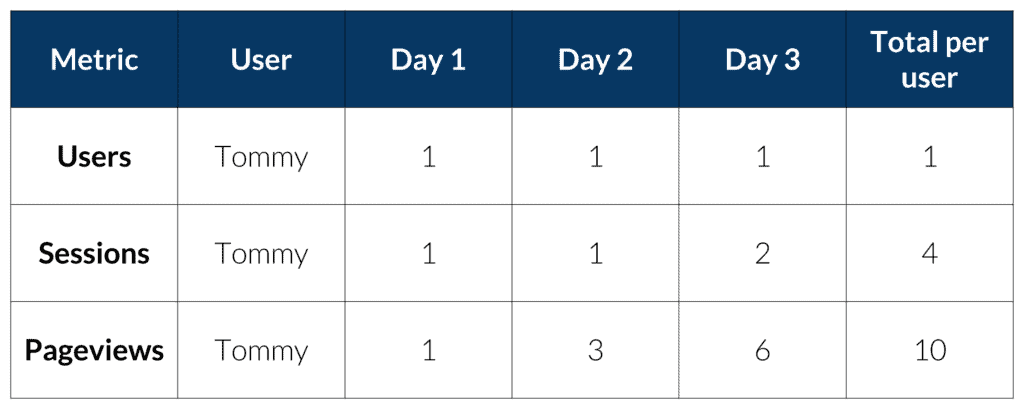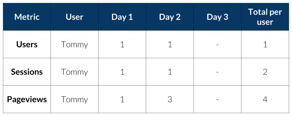 Sessions and pageviews are added up, but users aren’t. That’s because Google Analytics knows (thanks to the cookie placed on the browser) that it’s Tommy who came back to your site and not a different user.