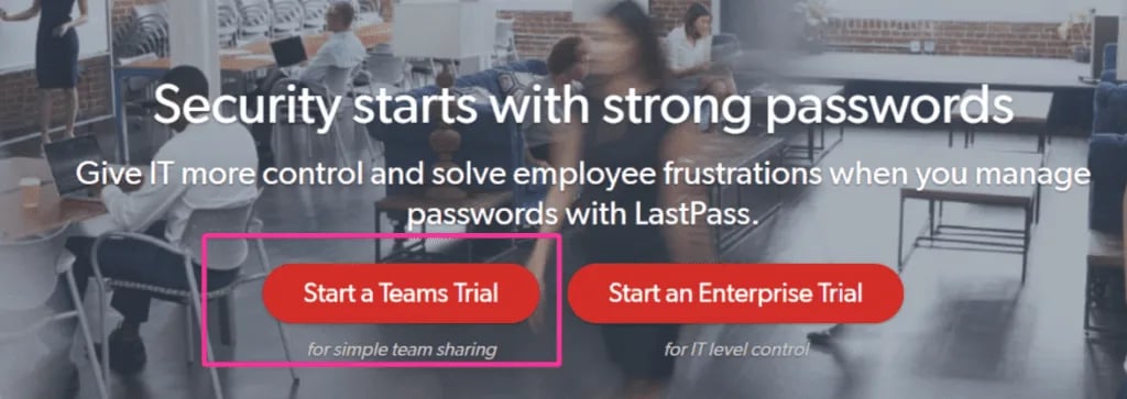 - Sign up for a LastPass Teams account by entering your email and selecting the estimated number of users from the drop-down menu. Click on “Start My Free Trial”;