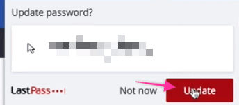 - You will see a LastPass pop-up notification asking if you want to update the password. Click on “Update”. This will save the account and password in your LastPass vault.