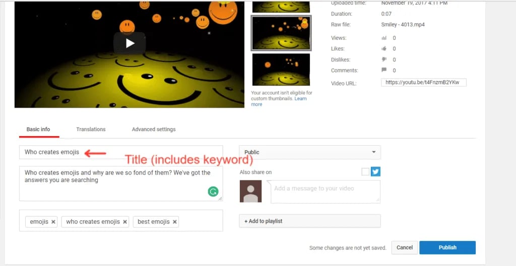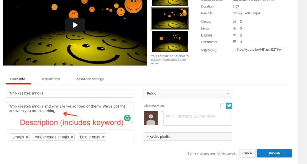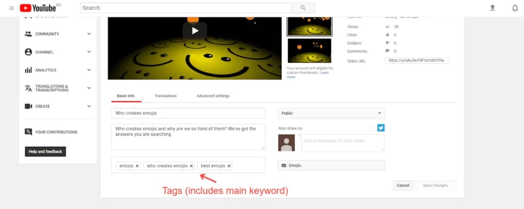Video tags are nothing but keywords - so use a few of them to let YouTube know what your video is about. Same as optimizing the video title and the video description, adding these video tags will also help YouTube determine what your video is about. Make sure to use relevant keywords as your video tag. You can add your YouTube video tags or hashtags when you upload a video on the same page that prompts you to add a video title and a description. You don’t need more than 2-3 keywords for this, but make sure they are relevant.